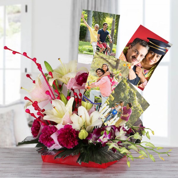 Giftnmore-5 Photos & 2 Lilies & 3 Orchids & 5 Roses Bucket Arrangement